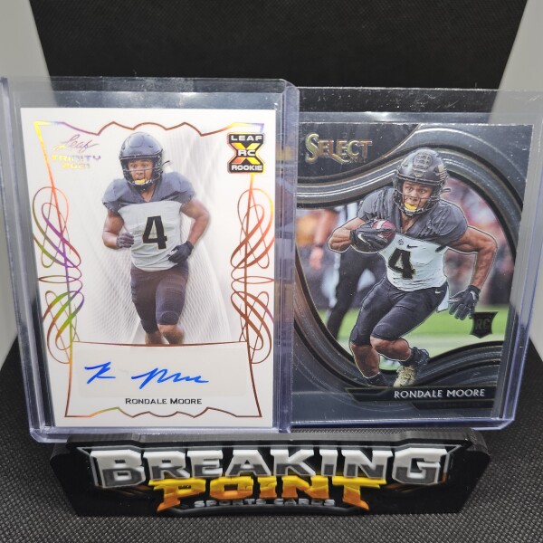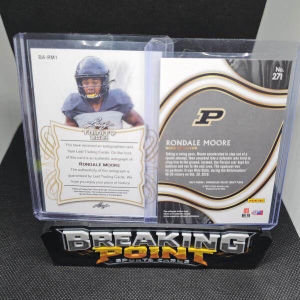 The product is a 2021 Rondale Moore rookie autograph trading card from the Leaf Trinity set. This standard-sized card features a label or sticker autograph from the player himself. Additionally, it includes a bonus rookie card of Rondale Moore in his PURDUE uniform. This limited edition, exclusive collectors' item is a sought-after piece for fans and collectors alike, especially for those interested in football memorabilia. The card is authenticated by Leaf and manufactured by Panini, making it a valuable addition to any sports trading card collection.