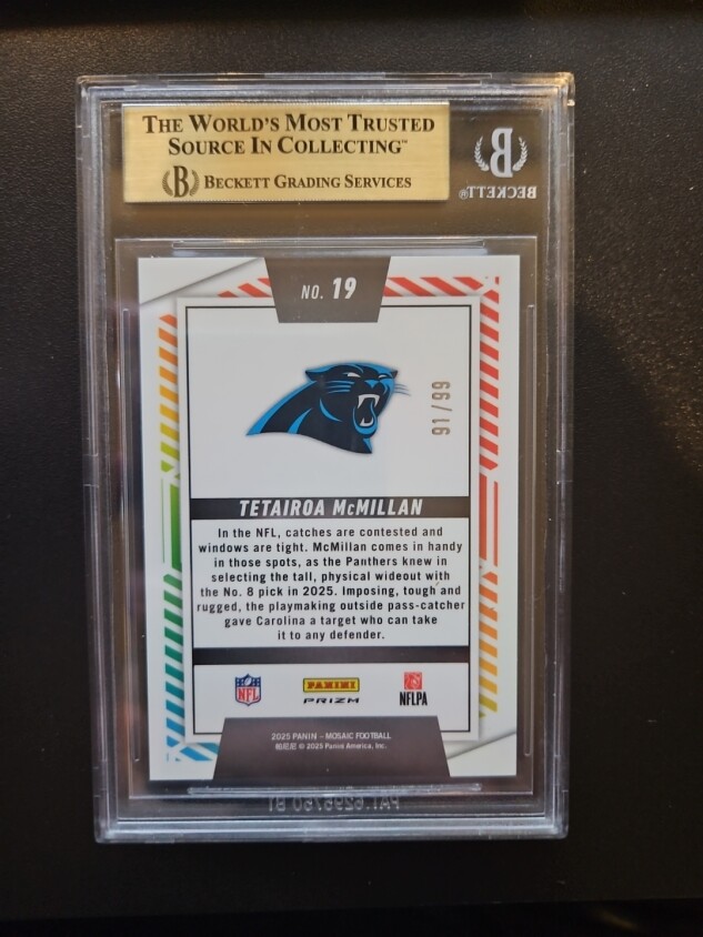 Should be a 10 Rookie Tetairoa McMillan/99 Mosaic Blue Men Of Mastery. Ready to ship