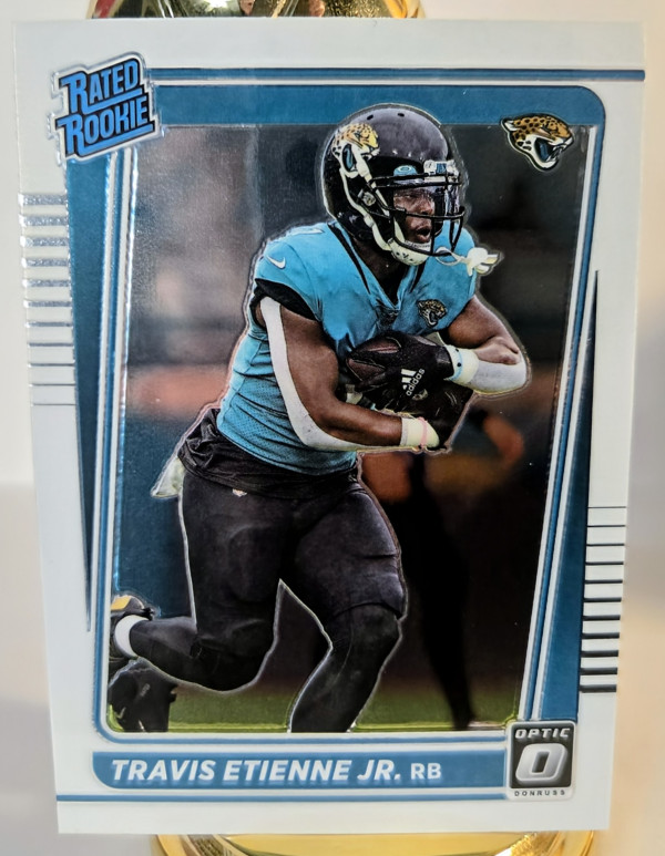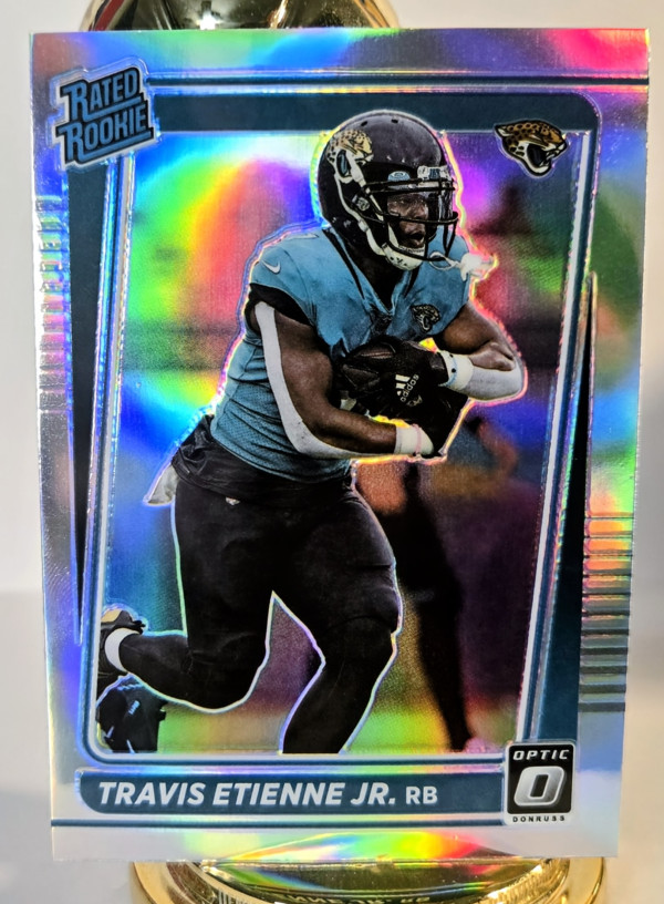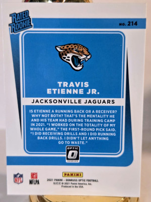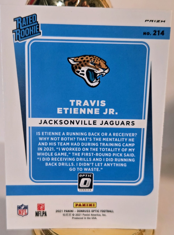 The product is a set of 2 standard size trading cards featuring Travis Etienne Jr, a rookie player for the Jacksonville Jaguars in the NFL. The cards are manufactured by Panini and are part of the 2021 Panini Donruss Optic football collection. One card is a Holo Prizm Rated Rookie #214, showcasing Etienne in his rookie season, while the other is a base card. Made of card stock, these original cards are not autographed and are authenticated by Donruss. A great addition to any football card collection, especially for fans of Travis Etienne and the Jacksonville Jaguars.