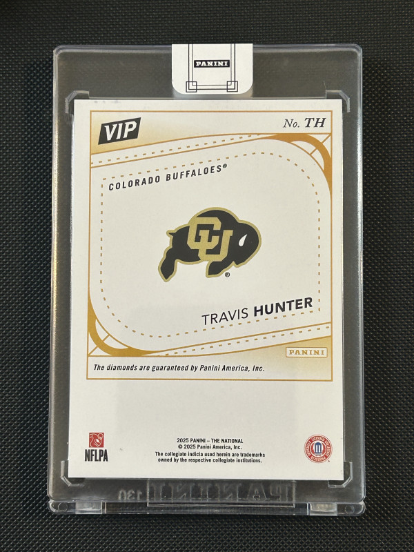 The product is a highly sought-after Travis Hunter 2024 The National VIP Sealed Gem Dual Diamond 1/1 #TH RC trading card. Manufactured by Panini in 2025, this original sports trading card features a unique design with a diamond parallel variety, making it a rare collectible for football fans. The card showcases features such as being serial numbered, a one-of-a-kind hologram, and a short print design, all adding to its value and appeal to collectors. With only a limited print run of 1, this card is a special addition to any sports trading card collection.