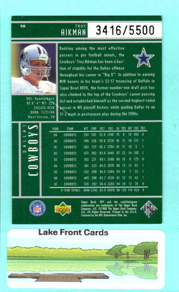 Up for sale is a Troy Aikman #98 card from the 1998 SPx Finite set, individually numbered 3416/5500.