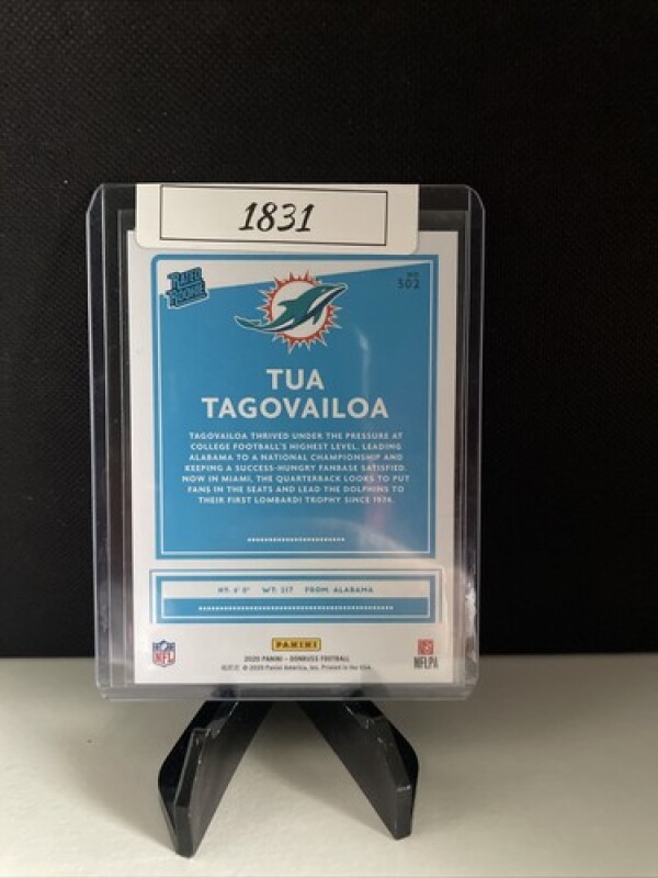 This is a Tua Tagovailoa 2020 Panini Donruss #302 RC trading card. It features the rookie quarterback of the Miami Dolphins in the National Football League (NFL). The card is made of high-quality card stock material and is an original base set card. It is perfect for any football fan or collector who wants to add a piece of sports memorabilia to their collection. This card is not autographed and is a standard size card. The card number is 302 and it was manufactured in the United States by Donruss.