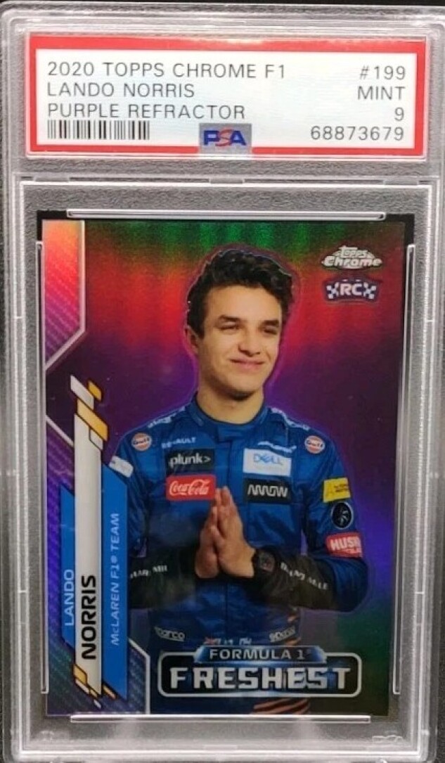 The product is a 2020 Topps Chrome Formula 1 Purple Refractor Lando Norris Rookie Card graded as a PSA 9. This single-parallel card features Lando Norris from the McLaren Formula 1 Team, with a print run of 399. It is a part of the original 2020 Topps Chrome Formula 1 set and is serial-numbered, making it a valuable addition to any sports trading card collection for fans of auto racing and Formula 1.