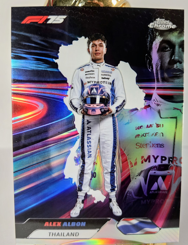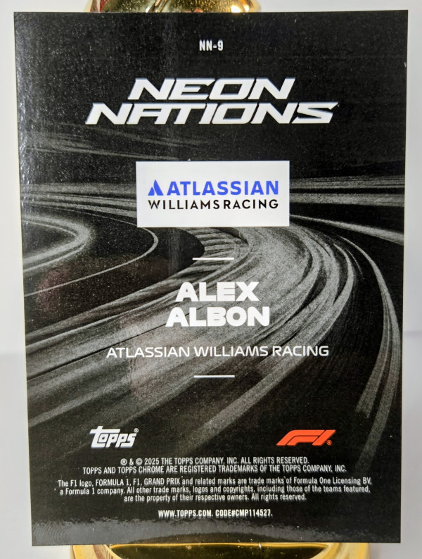 The product is a 2025 Topps Chrome Formula 1 trading card featuring Alex Albon from Williams Racing. This card is a part of the Neon Nations insert set, known as a case hit. The card showcases a neon design and is a collectible item for fans of auto racing and sports trading cards. With a focus on the player, team, set, and year, this rare card is a sought-after addition for collectors looking to own a piece of Formula 1 history.