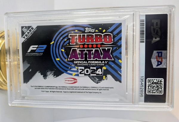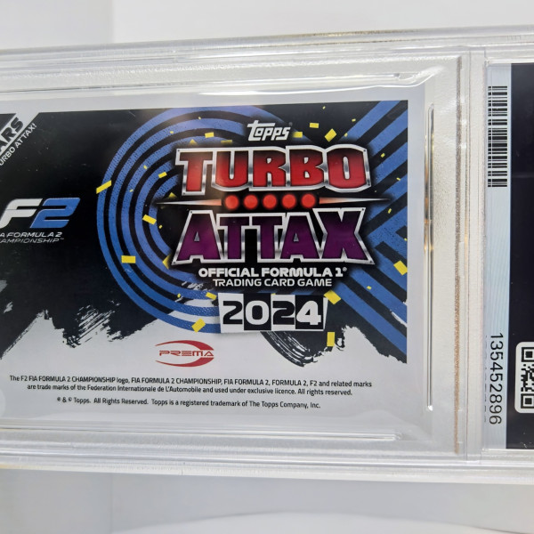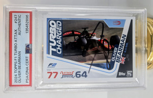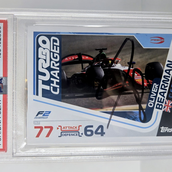 The product is a 2024 Topps F1 Turbo Attax trading card featuring an on-card autograph from Oliver Bearman, a Formula 1 and Formula 2 athlete. The autograph is authenticated by Professional Sports Authenticator (PSA), making it a valuable collectible for fans of auto racing and sports trading cards. The card number is 247 and it falls within the Topps set for the 2024 season, making it a sought-after item for collectors. This unique card offers fans the opportunity to own a piece of history signed by a rising star in the world of Formula 1.