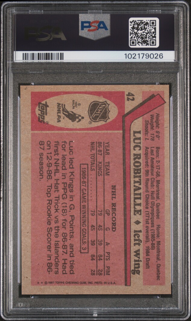 You are purchasing a 1987-88 Topps Luc Robitaille #42 Rookie PSA 9. You will receive the exact item in the photographs. Thank you for looking.