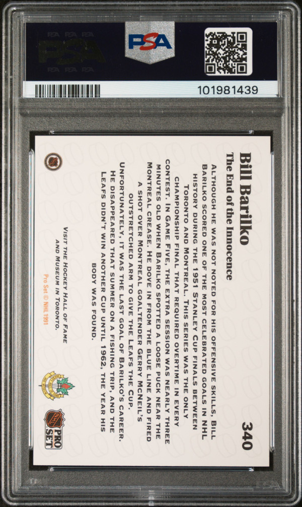 You are purchasing a 1991 Pro Set Bill Barilko #340 PSA 7. You will receive the exact card in the photographs. Thank you for looking.