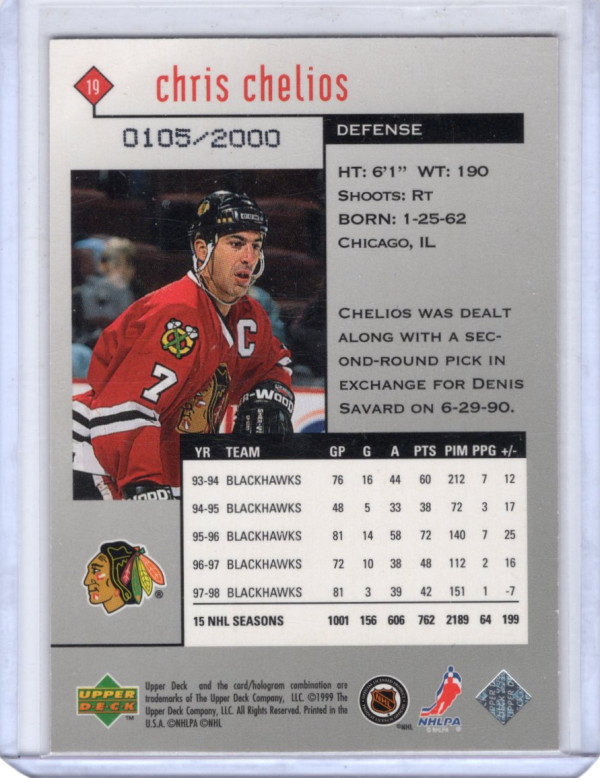 You are purchasing a 1999-00 Upper Deck Black Diamond Chris Chelios #19 0105/2000. You will receive the exact item in the photographs. Thank you for looking.