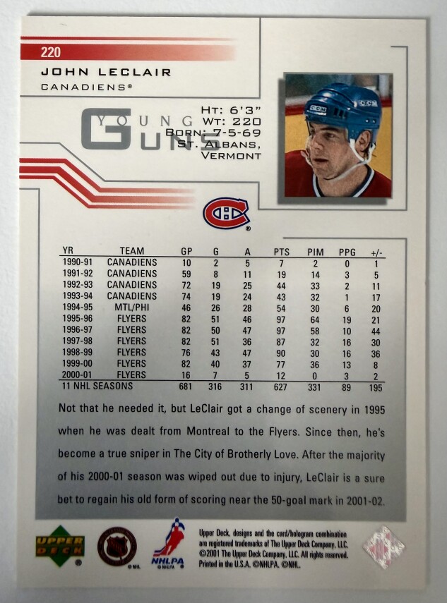 You are purchasing a 2001 Upper Deck Young Guns Flashback John LeClair. You will receive the exact item in the photographs. Thank you for looking.