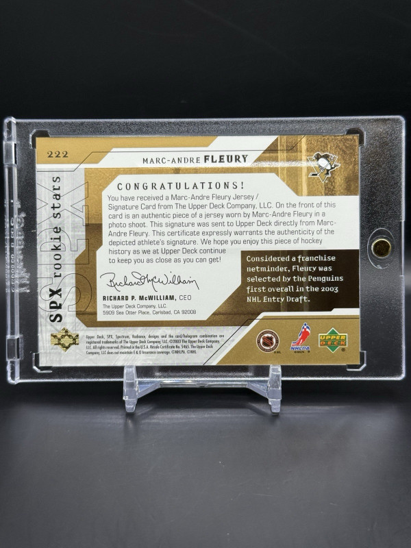You are purchasing a 2003 SPx Marc-Andre Fleury Radiance Rookie. You will receive the exact item in the photographs. Thank you for looking.