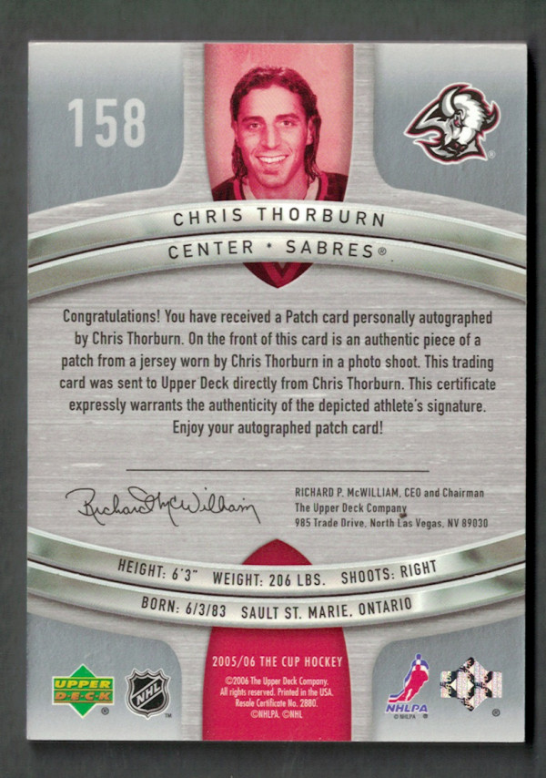 2005-06 Upper Deck The Cup Autograph Patch Rookie Chris Thorburn 019/199