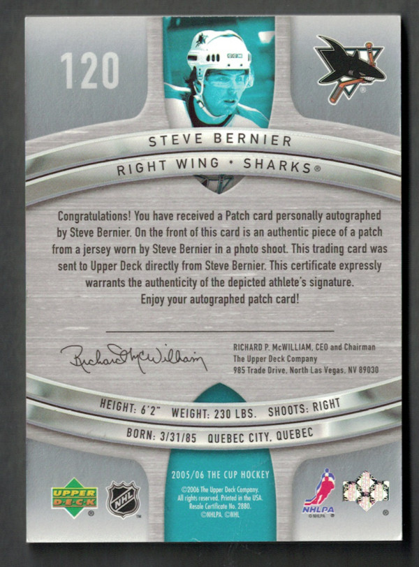 2005-06 Upper Deck The Cup Autograph Patch Rookie Steve Bernier 167/199