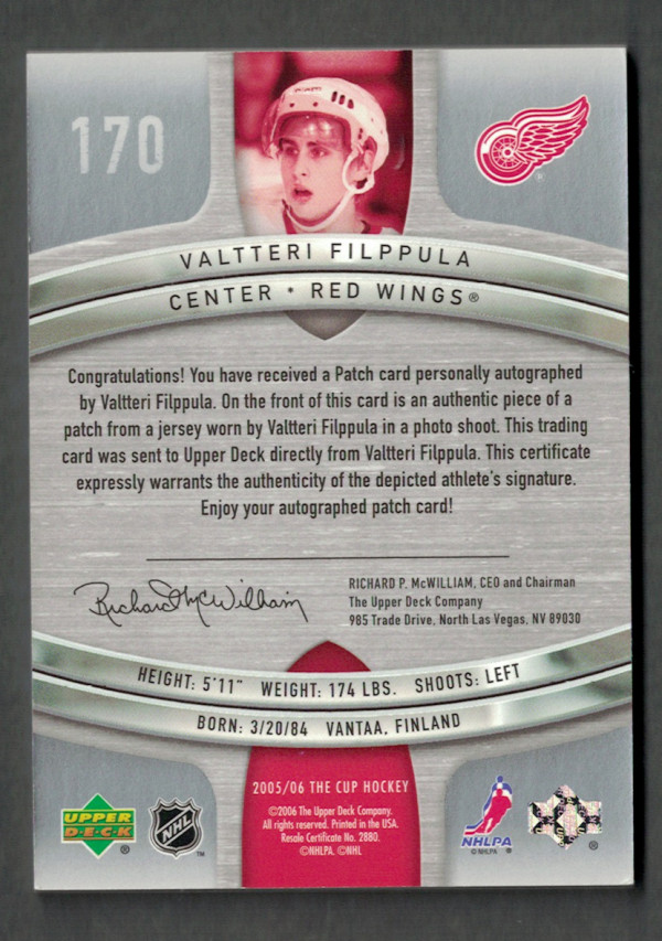 2005-06 Upper Deck The Cup Autograph Patch Rookie Valtteri Filppula 103/199
