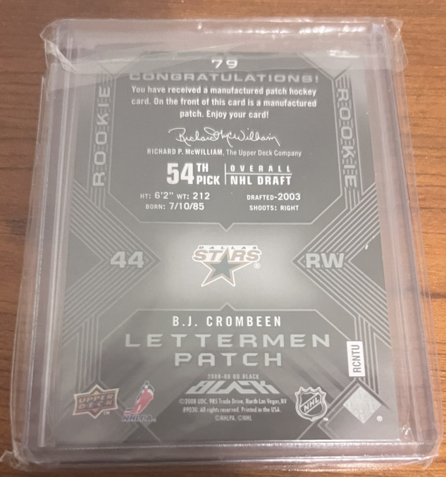 2008-09 Upper Deck UD Black Rookie Lettermen /399 BJ Crombeen #79 Dallas Stars Letter "N" **LOPSIDED TRADE OFFER PLEASE READ**