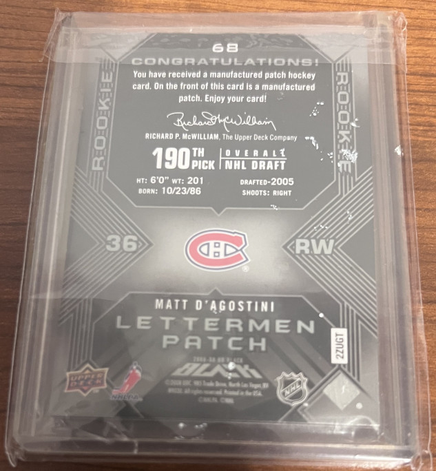 2008-09 Upper Deck UD Black Rookie Lettermen /399 Matt D'Agostini #68 Montreal Canadiens Letter "G"