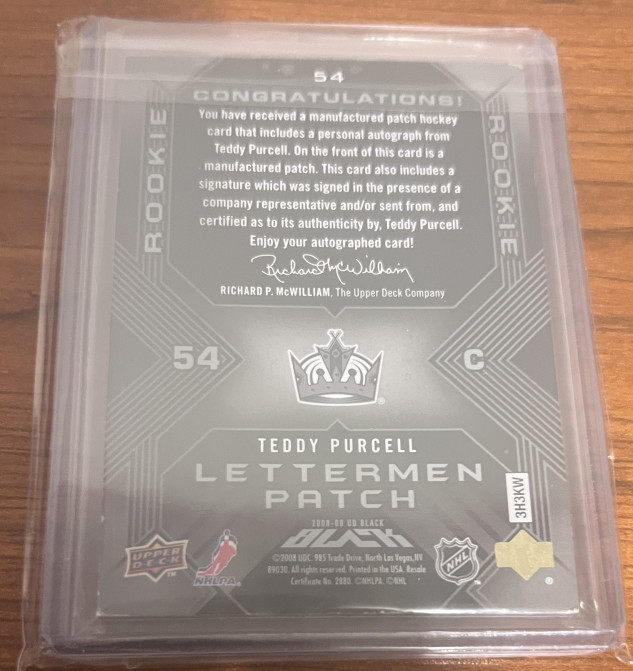 2008-09 Upper Deck UD Black Rookie Lettermen /399 Teddy Purcell #54 AUTO Los Angele Kings Letter "E"