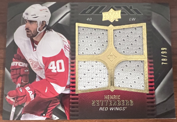 Quad Patch of former NHL player Henrik Zetterberg. Card #15 from the 2009-10 Upper Deck UD Black set. Serial numbered 78/99