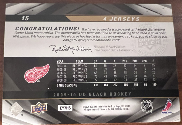 2009-10 Henrik Zetterberg Upper Deck UD Black #15 4 Jerseys quad patch /99
