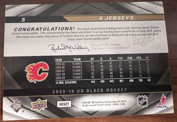 Quad Patch of NHL Hall of Famer Jarome Iginla. Card #5 from the 2009-10 Upper Deck UD Black set. Serial numbered 33/99.