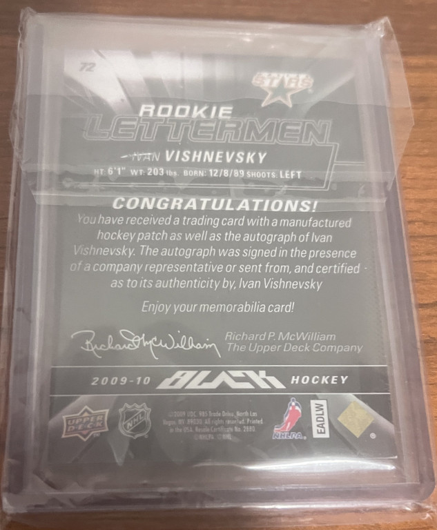 2009-10 Upper Deck UD Black Rookie Lettermen /499 Ivan Vishnevskiy Vishnevsky #72 AUTO Dallas Stars Letter "K". While I will consider trades, I am more interested in selling. PLEASE look at my profile because what I will accept in trade is very specific. If you offer me in trade something that is not listed in my profile, I will not reply. Thank you for looking.