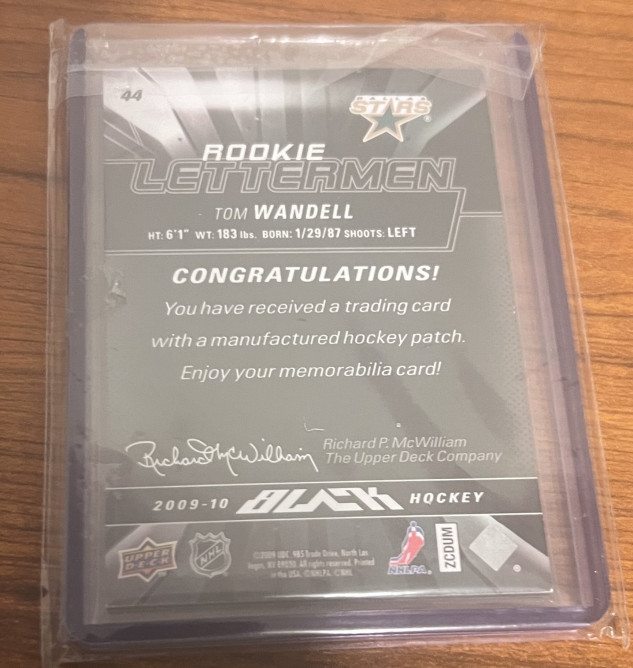 2009-10 Upper Deck UD Black Rookie Lettermen /499 Tom Wandell #44 Dallas Stars Letter "A". While I will consider trades, I am more interested in selling. PLEASE look at my profile because what I will accept in trade is very specific. If you offer me in trade something that is not listed in my profile, I will not reply. Thank you for looking.