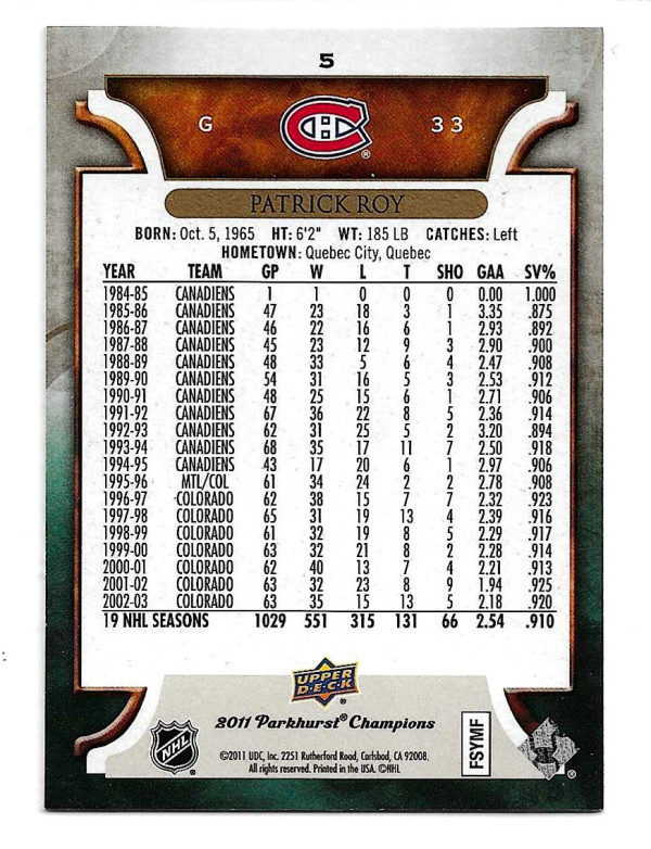 2011-12 PARKHURST CHAMPIONS #5 PATRICK ROY