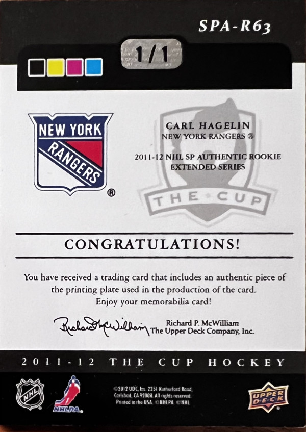 2011-12 Upper Deck The Cup Rookie Masterpieces SP Authentic Cyan Plate 1/1, Carl Hagelin