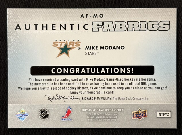 2012-13 Upper Deck Sp Game Used Authentic Fabrics 02/35 #AFMO Mike Modano