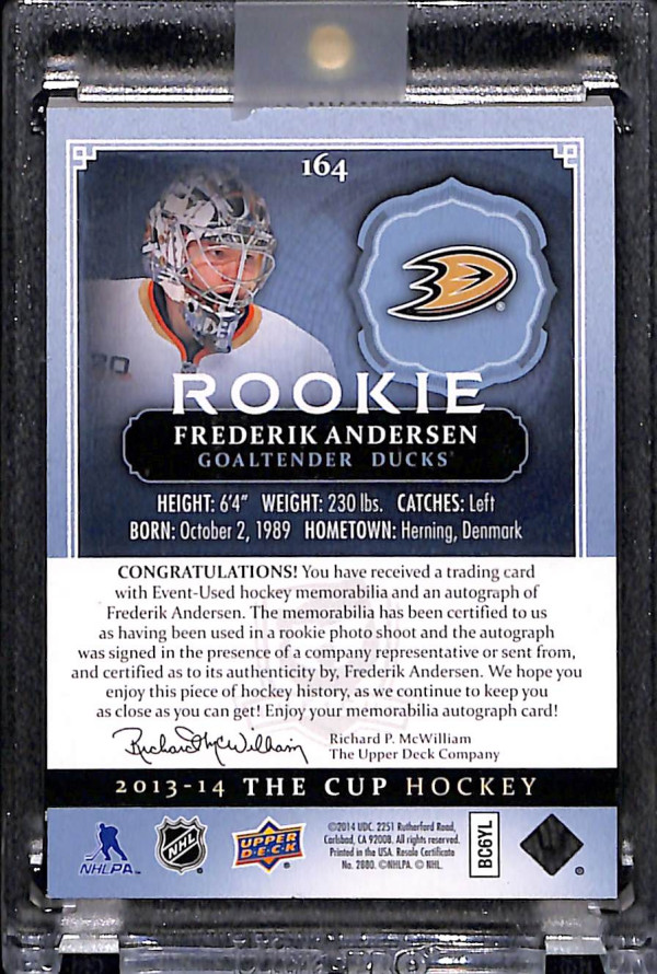 You are purchasing a 2013-14 Upper Deck The Cup Frederik Andersen #164 106/249. You will receive the exact card in the photographs. Thank you for looking.