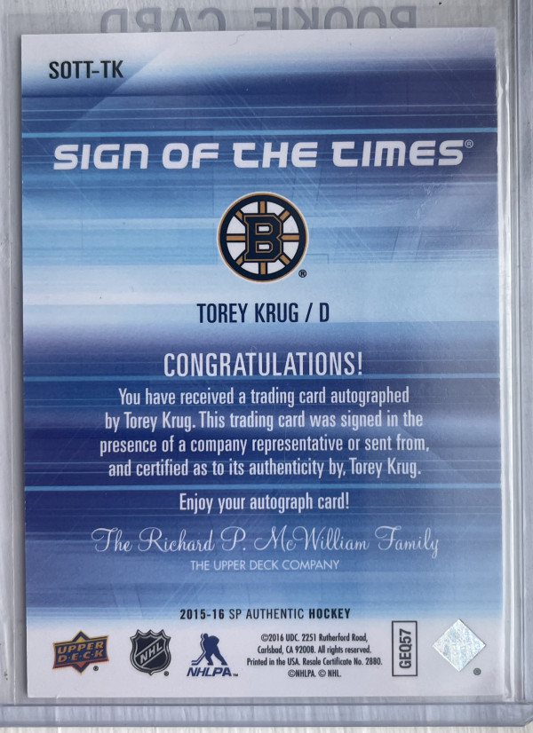 2015-16 SP Authentic Sign Of The Times Auto Torey Krug Auto #SOTT-TK