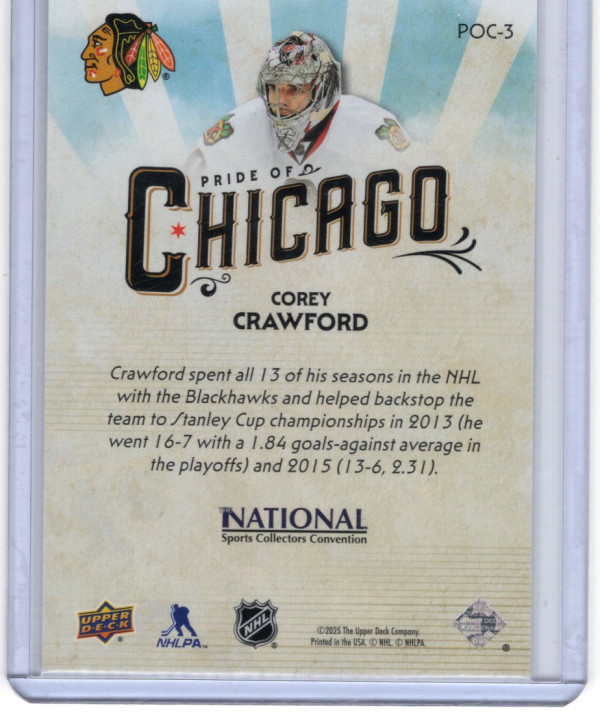 You are purchasing a 2015 Upper Deck Pride of Chicago Corey Crawford #POC-3. You will receive the exact item in the photographs. Thank you for looking.