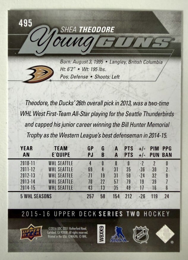 You are purchasing a 2015 Upper Deck Series Two Young Guns Shea Theodore Rookie. You will receive the exact item in the photographs. Thank you for looking.