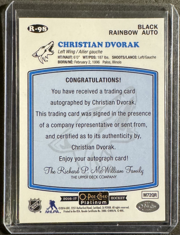 2016-17 OPC Platinum Christian Dvorak Black Rainbow Rookie Auto