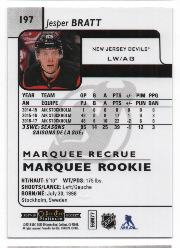 2017-18 O-Pee-Chee Platinum #197 Jesper Bratt RC