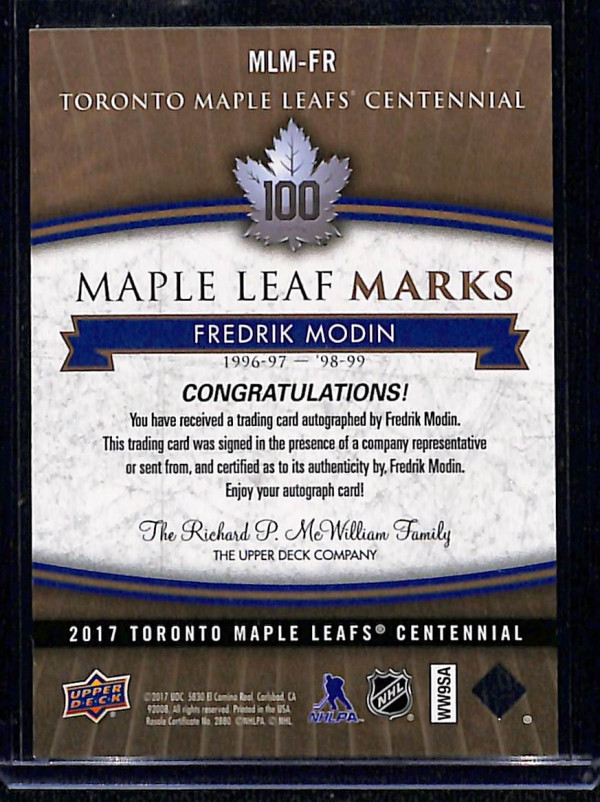 You are purchasing a 2017 Toronto Maple Leafs Centennial Fredrik Modin #MLM-FR. You will receive the exact card in the photographs. Thank you for looking.