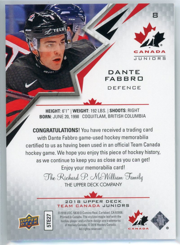 2018-19 Upper Deck #8 Dante Fabbro Team Canada Juniors Jersey