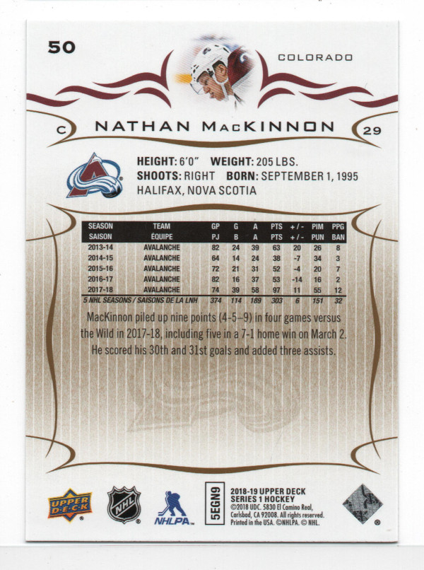 2018-19 Upper Deck ePack Speckled Rainbow Foil Parallel #50 Nathan MacKinnon