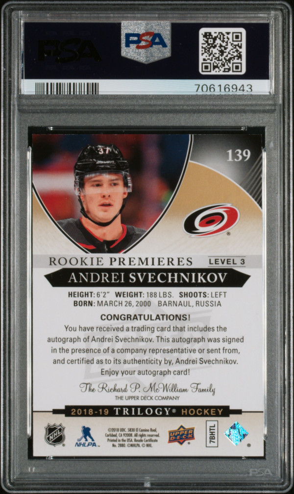 You are purchasing a 2018 Upper Deck Trilogy Andrei Svechnikov #139 Autograph PSA 9. You will receive the exact card in the photographs. Thank you for looking. Listed with Mascot.