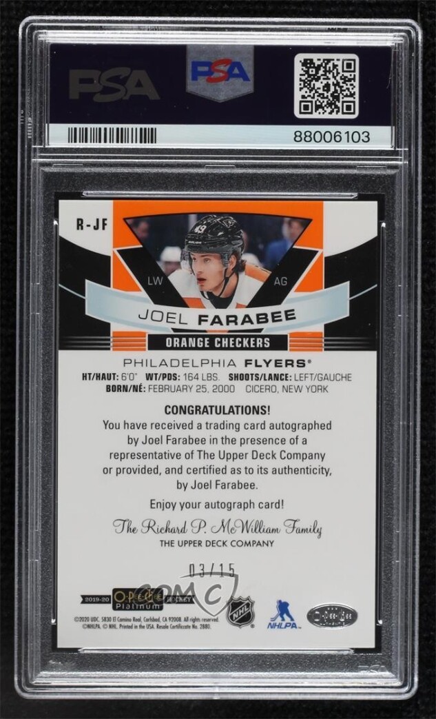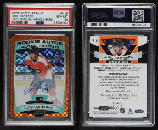 You are purchasing a 2019-20 O-Pee-Chee Platinum - Rookie Autos - Orange Checkers Joel Farabee Orange Checkers PSA 10. You will receive the exact item in the photographs. Thank you for looking.