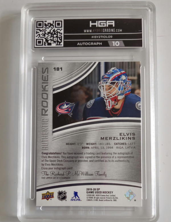 2019-20 SP Game Used Elvis Merzlikins Black Rainbow Rookie Auto /5 HGA 9