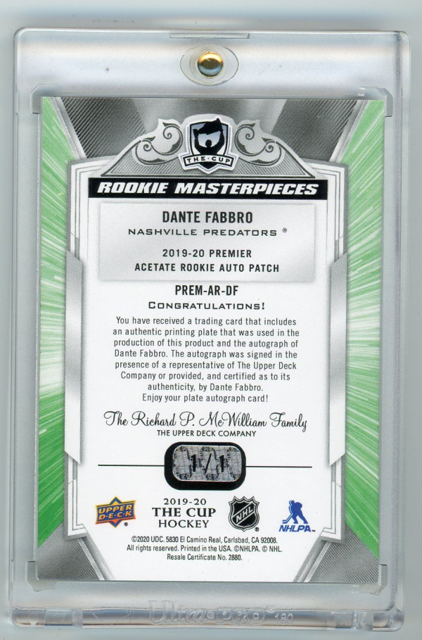 2019-20 The Cup Dante Fabbro Rookie Masterpieces Plate Autograph 1/1