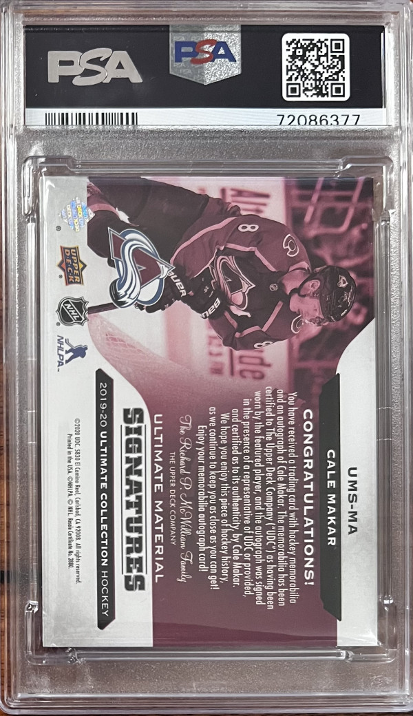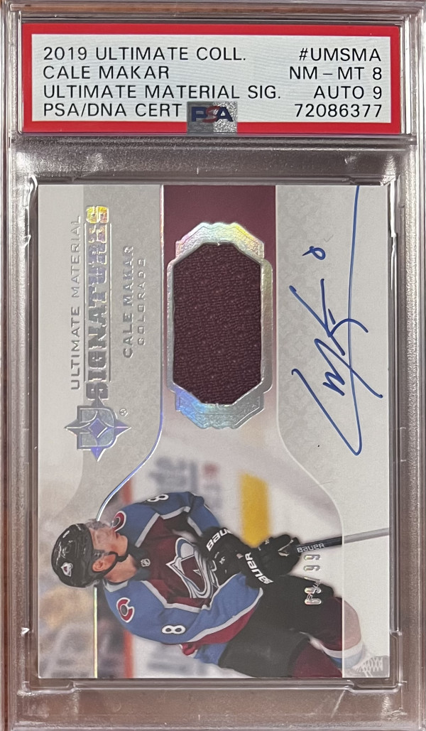 2019-20 Ultimate Collection Ultimate Material Signatures /99, Cale Makar PSA 8 Auto PSA 9