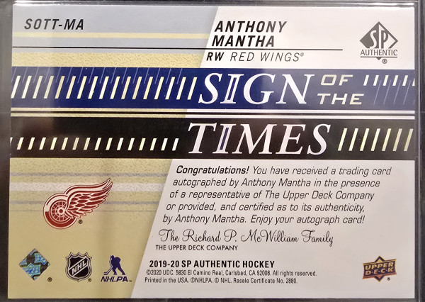 2019-20 Upper Deck SP Authentic Sign of the Times #SOTT-MA Anthony Mantha