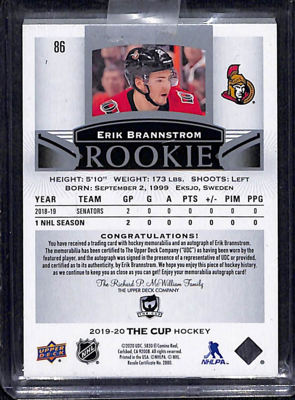 You are purchasing a 2019-20 Upper Deck The Cup Erik Brannstrom #86 Patch 184/249. You will receive the exact card in the photographs. Thank you for looking.