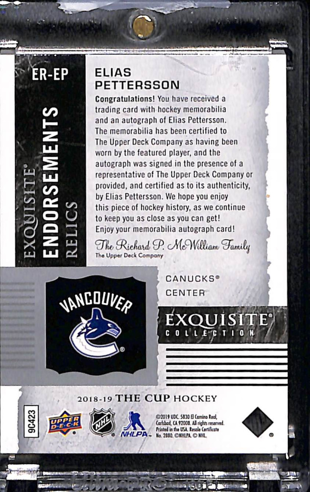 2019 2018-19 Upper Deck The Cup Elias Pettersson #ER-EP Rookie Endorsements Relics /50
