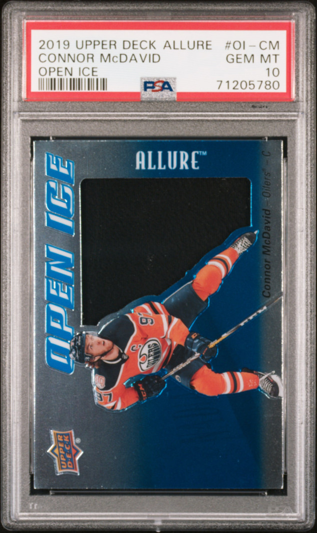 Connor McDavid Open Ice Allure in a PSA 10. Card looks awesome with the middle missing. HMU for deals.