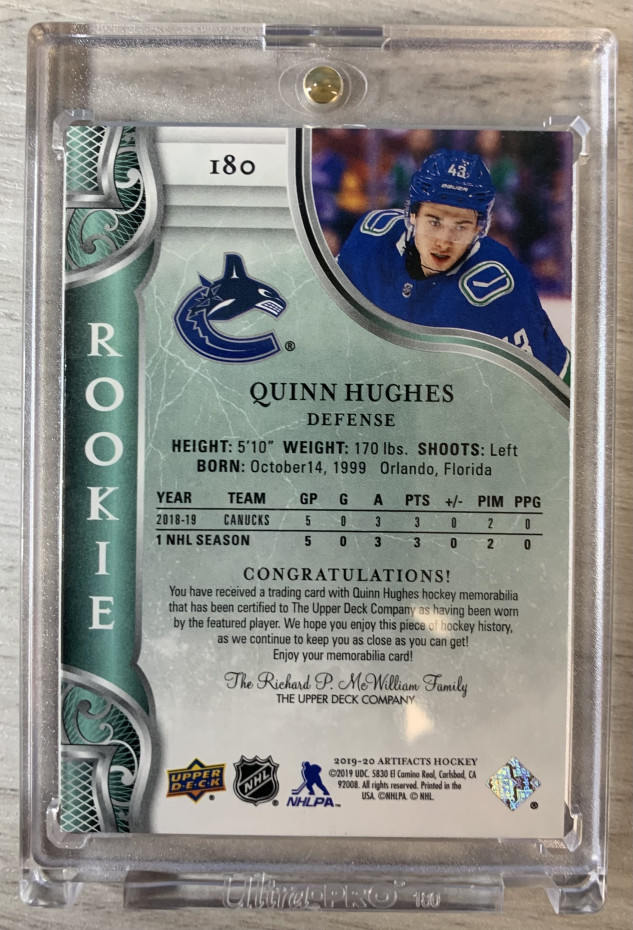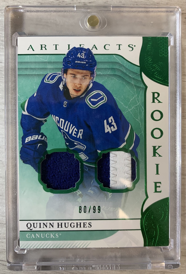 2019 Upper Deck Artifacts #180 Quinn Hughes Materials - Emerald