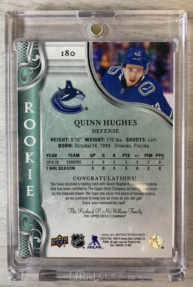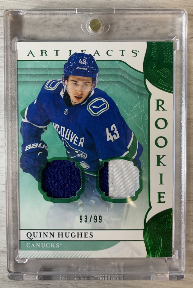 2019 Upper Deck Artifacts #180 Quinn Hughes Materials - Emerald