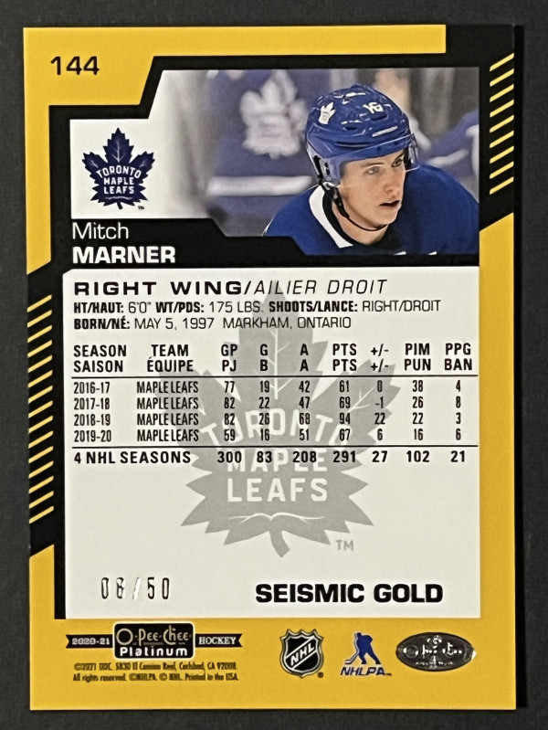 2020-21 O-Pee-Chee Platinum Seismic Gold 8/50 #144 Mitch Marner
