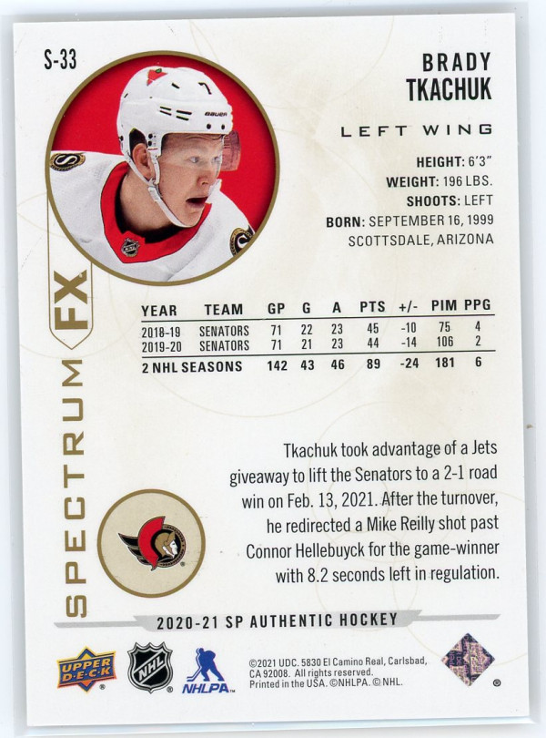 2020-21 SP Authentic #S-33 Brady Tkachuk Spectrum FX 31/50